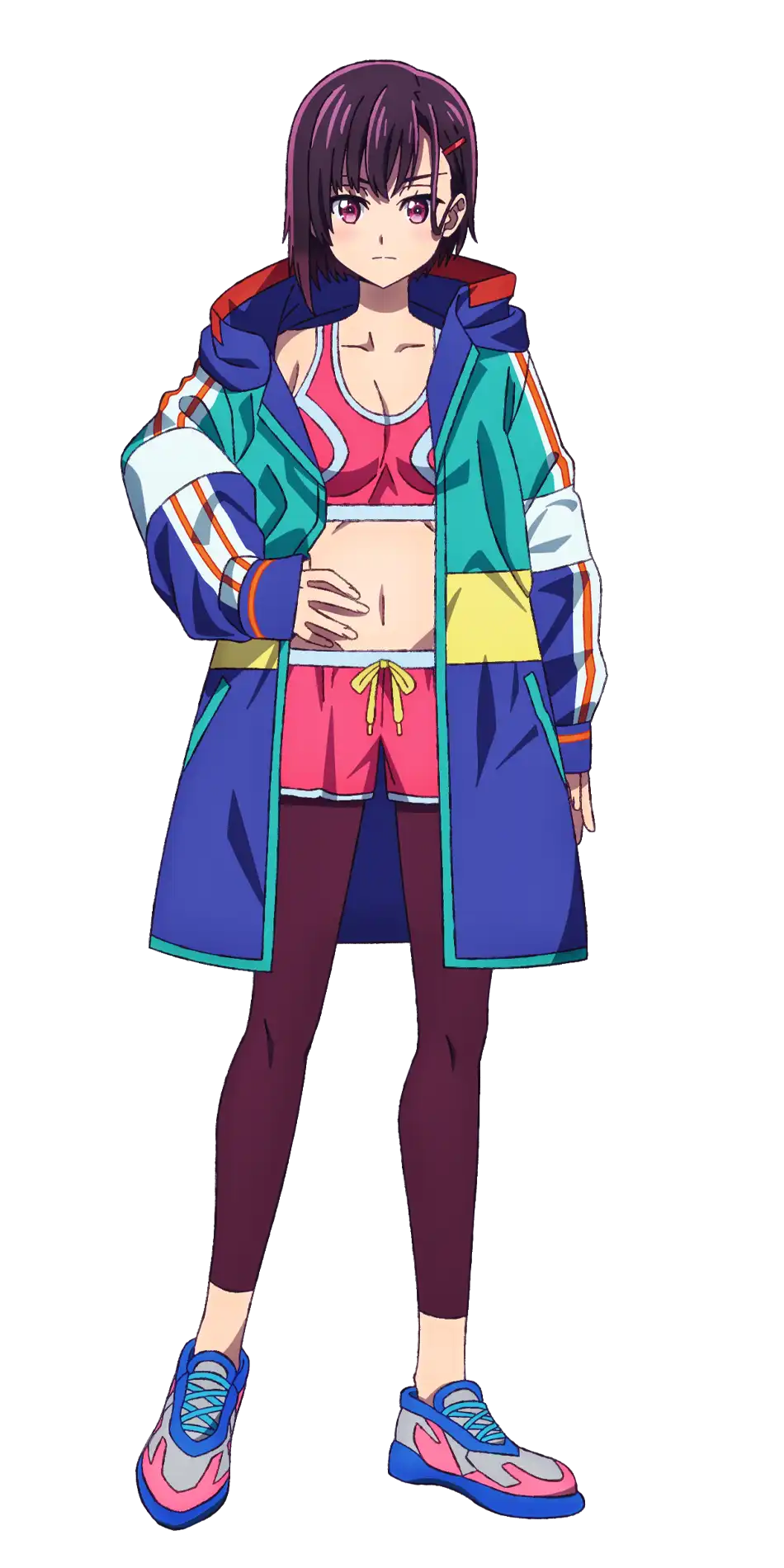 She wears a multi-colored overcoat over a pink and white sports bra with pale gray stripes top which shows her midriff and belly button as well as matching color short-shorts, indigo leggings and shoes.