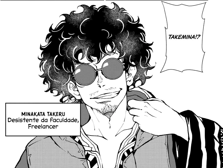 Takemina is a tall man with a black Afro, he wears round sunglasses and an almost hippy outfit.